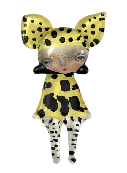 Autorska broszka wykonana z pełnego szkła, wytapiana ręcznie i malowana. Szkło hartowane, najwyższej jakości, bardzo trwałe. Każda z laleczek jest unikatowa - ręcznie malowana, szklana soczewka daje efekt złudzenia optycznego i głębi spojrzenia.