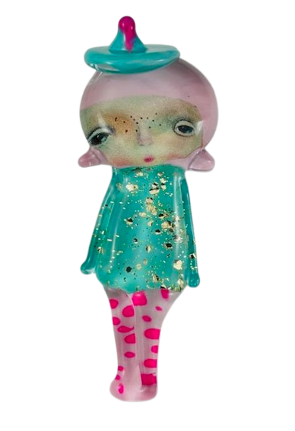 Autorska broszka wykonana z pełnego szkła, wytapiana ręcznie i malowana. Szkło hartowane, najwyższej jakości, bardzo trwałe. Każda z laleczek jest unikatowa - ręcznie malowana, szklana soczewka daje efekt złudzenia optycznego i głębi spojrzenia.