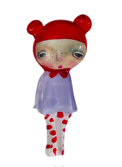 Autorska broszka wykonana z pełnego szkła, wytapiana ręcznie i malowana. Szkło hartowane, najwyższej jakości, bardzo trwałe. Każda z laleczek jest unikatowa - ręcznie malowana, szklana soczewka daje efekt złudzenia optycznego i głębi spojrzenia.