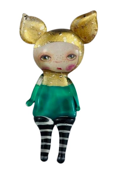 Autorska broszka wykonana z pełnego szkła, wytapiana ręcznie i malowana. Szkło hartowane, najwyższej jakości, bardzo trwałe. Każda z laleczek jest unikatowa - ręcznie malowana, szklana soczewka daje efekt złudzenia optycznego i głębi spojrzenia.
