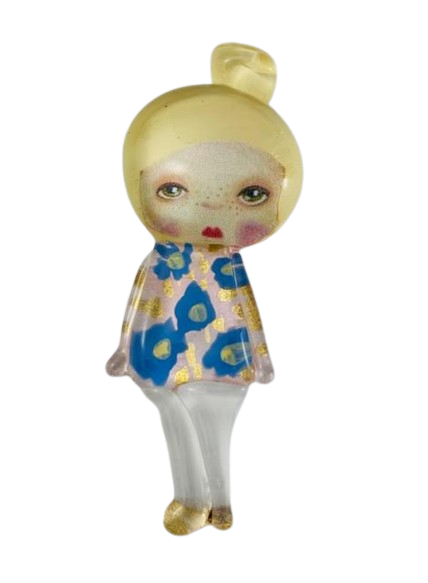 Autorska broszka wykonana z pełnego szkła, wytapiana ręcznie i malowana. Szkło hartowane, najwyższej jakości, bardzo trwałe. Każda z laleczek jest unikatowa - ręcznie malowana, szklana soczewka daje efekt złudzenia optycznego i głębi spojrzenia.