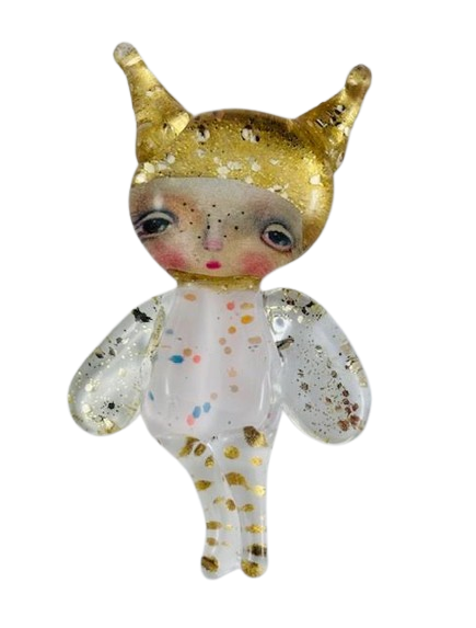 Autorska broszka wykonana z pełnego szkła, wytapiana ręcznie i malowana. Szkło hartowane, najwyższej jakości, bardzo trwałe. Każda z laleczek jest unikatowa - ręcznie malowana, szklana soczewka daje efekt złudzenia optycznego i głębi spojrzenia.