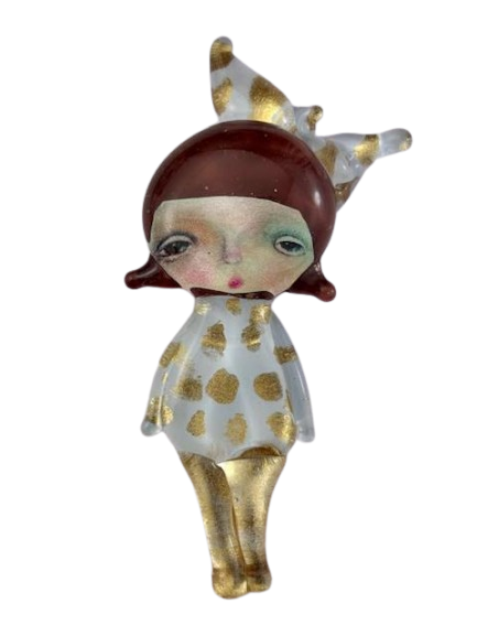 Autorska broszka wykonana z pełnego szkła, wytapiana ręcznie i malowana. Szkło hartowane, najwyższej jakości, bardzo trwałe. Każda z laleczek jest unikatowa - ręcznie malowana, szklana soczewka daje efekt złudzenia optycznego i głębi spojrzenia.