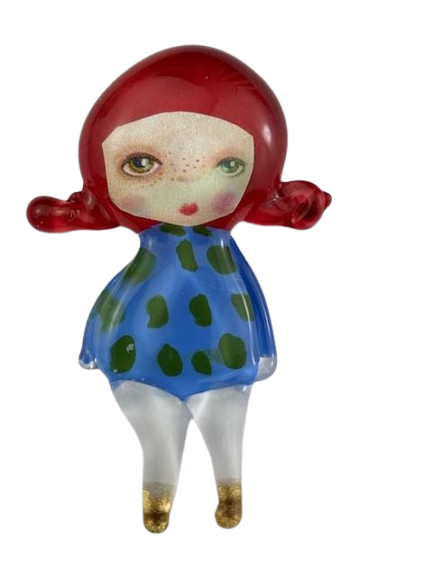 Autorska broszka wykonana z pełnego szkła, wytapiana ręcznie i malowana. Szkło hartowane, najwyższej jakości, bardzo trwałe. Każda z laleczek jest unikatowa - ręcznie malowana, szklana soczewka daje efekt złudzenia optycznego i głębi spojrzenia.