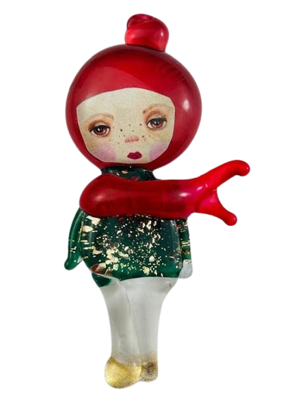 Autorska broszka wykonana z pełnego szkła, wytapiana ręcznie i malowana. Szkło hartowane, najwyższej jakości, bardzo trwałe. Każda z laleczek jest unikatowa - ręcznie malowana, szklana soczewka daje efekt złudzenia optycznego i głębi spojrzenia.